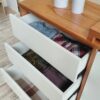 Enchapados en madera de paraíso , la cómoda cuenta con con una puerta con estante interno y tres cajones con correderas telescópicas, todo con frentes blancos.