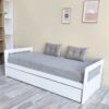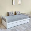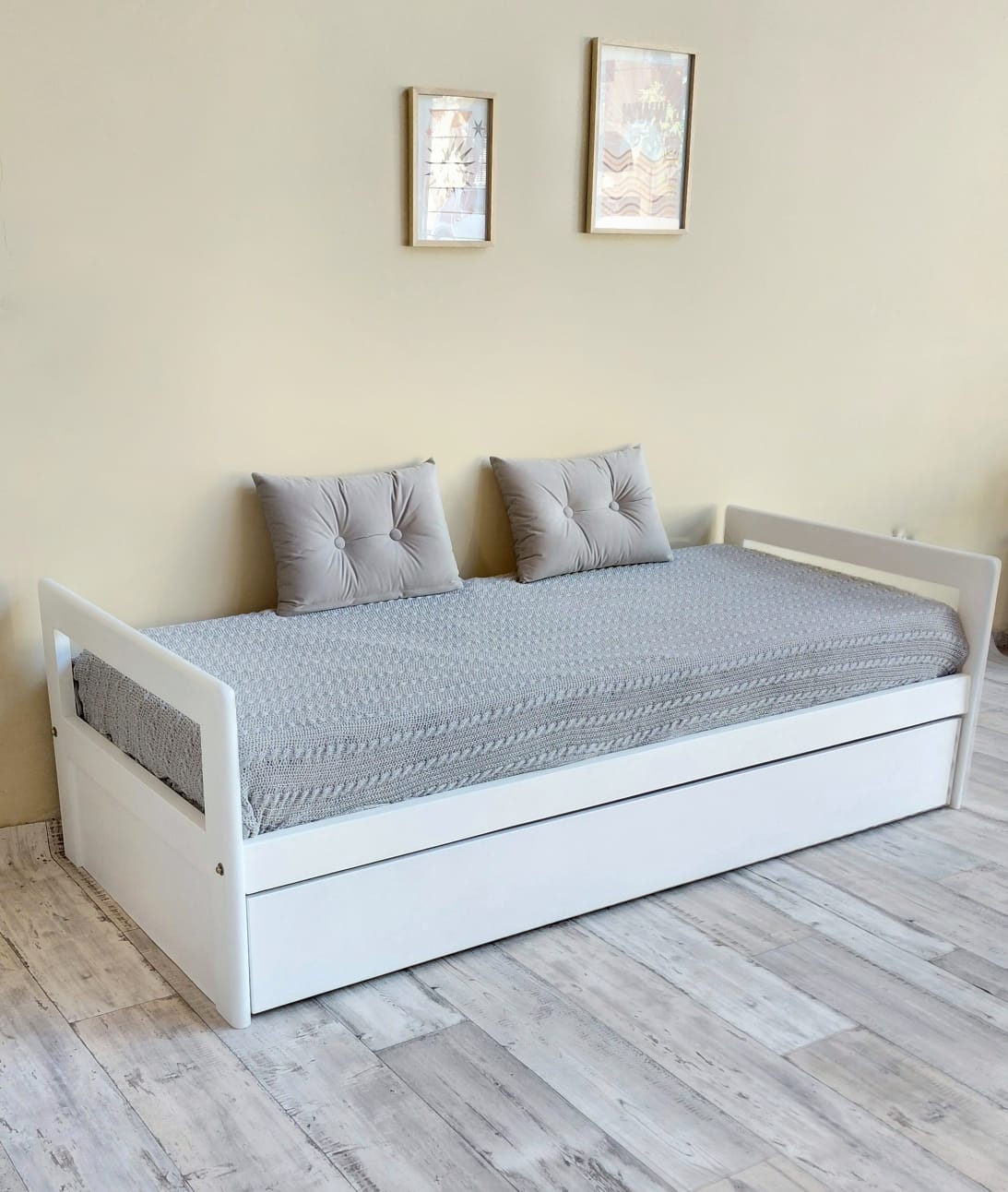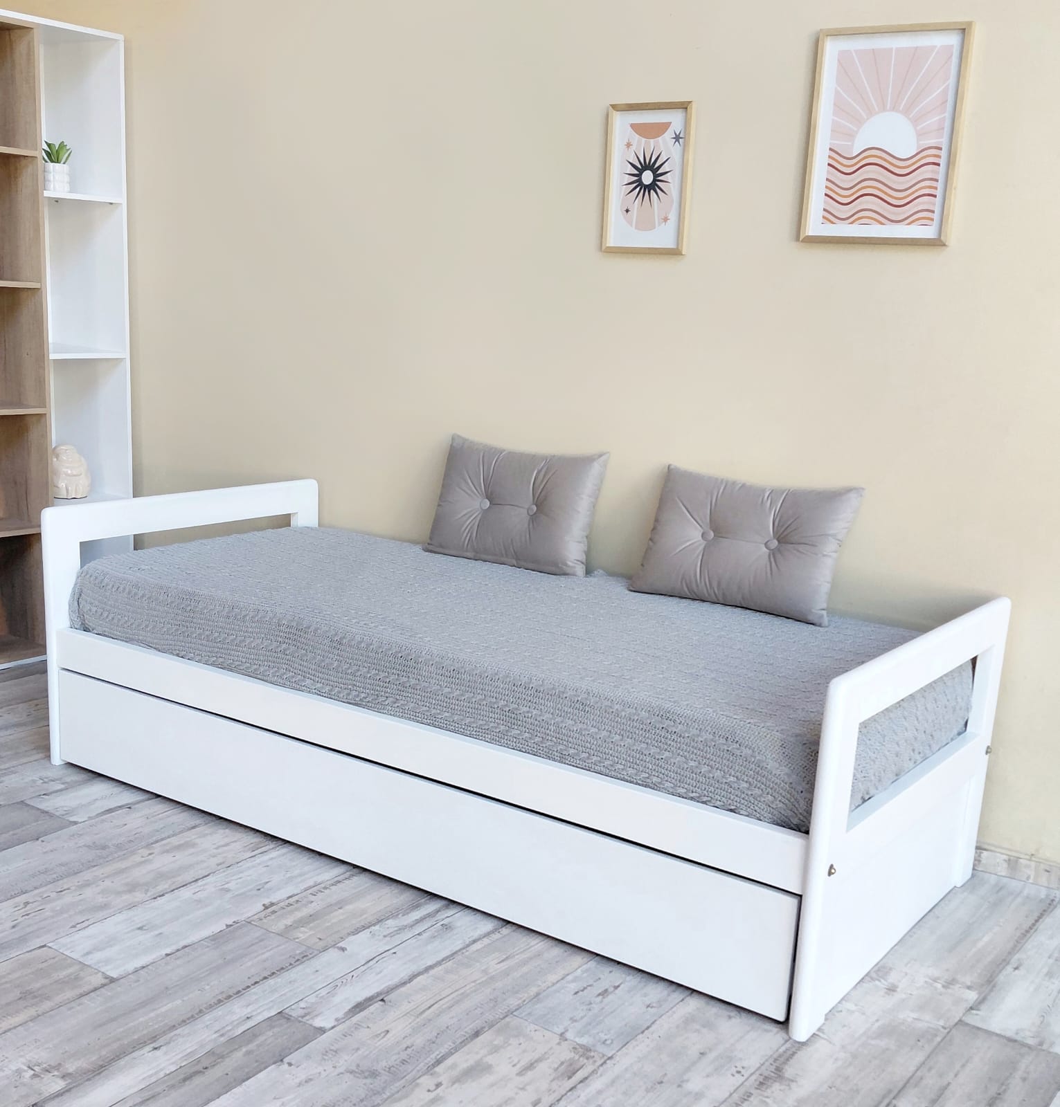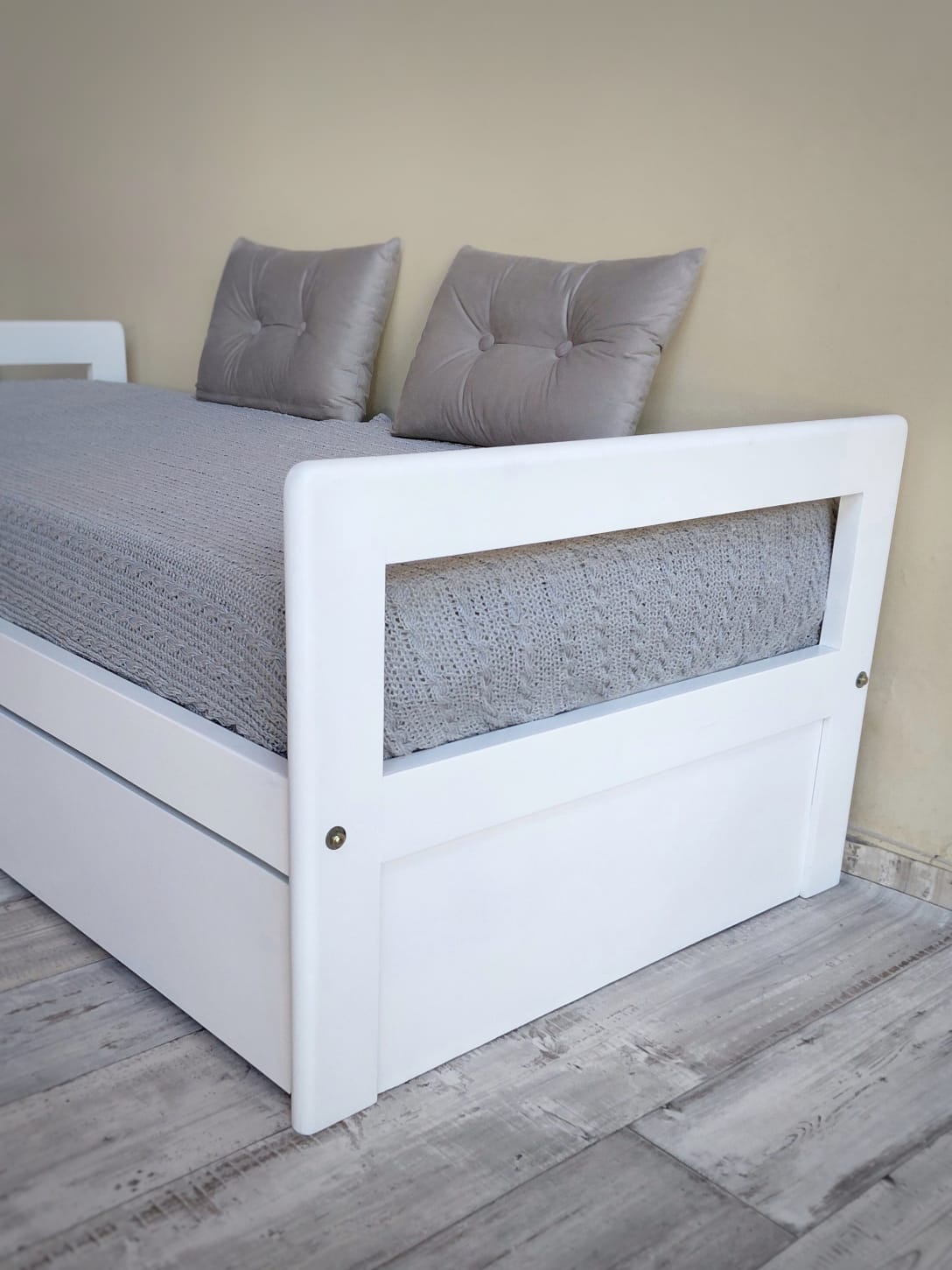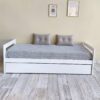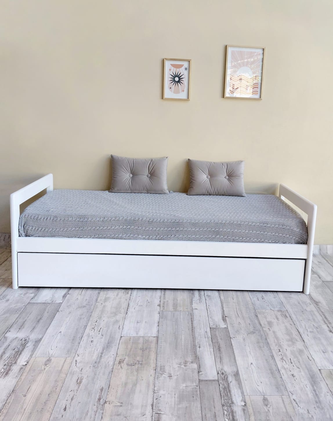Cama con carro de marinera de estilo americano, con estructura en madera maciza laqueada en blanco. Su diseño clásico y minimalista te permite usarla también como cama divan.