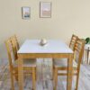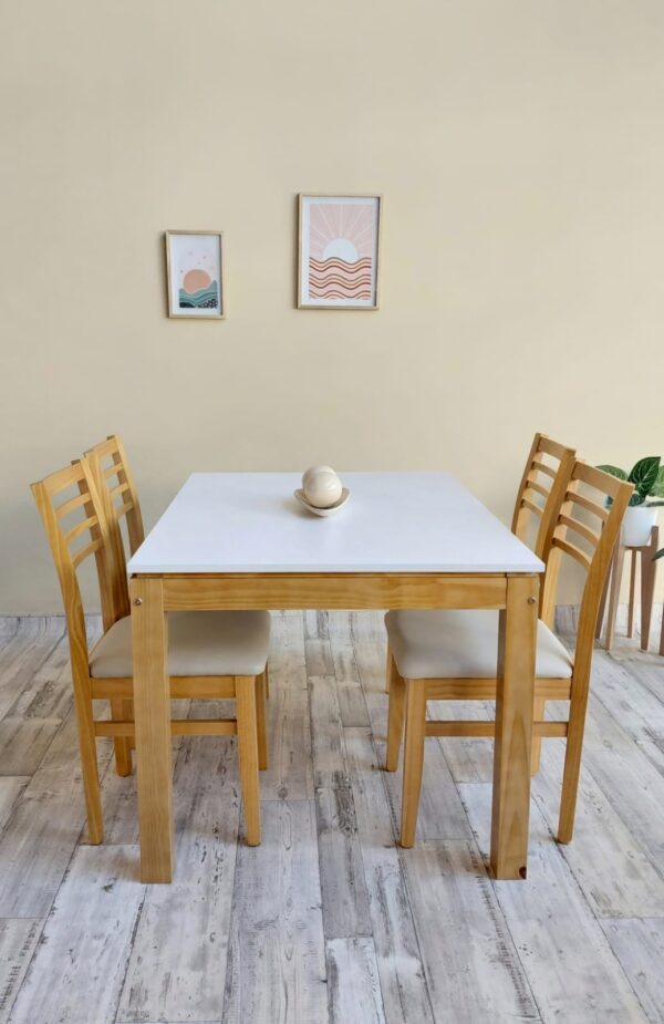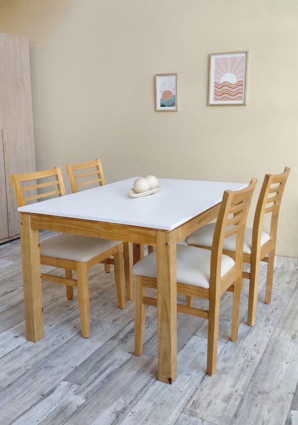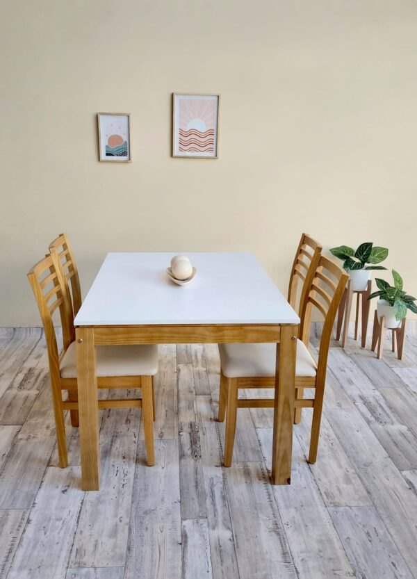Acompañada de 4 sillas modelo Clásicas en pino seleccionado color miel , con refuerzos en los laterales, con asiento tapizado en ecocuero beige.
