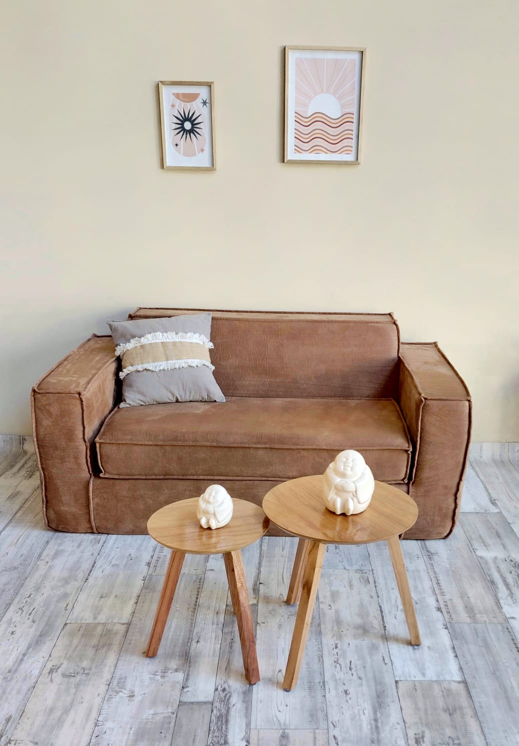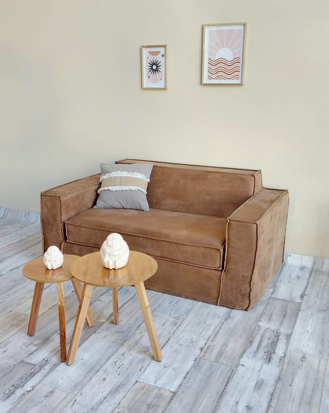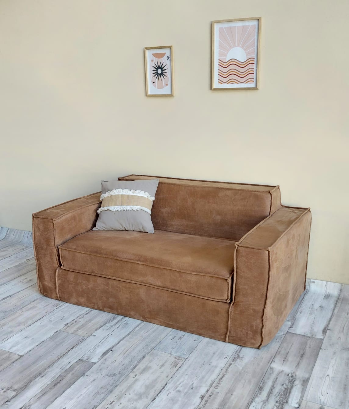 Tapizado en pana antimancha color suela, con detalle de ribete en las costuras.